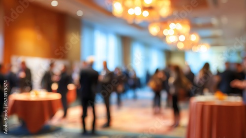 Blurred scene depicts a conference or reception with people mingling and socializing under bright chandeliers above