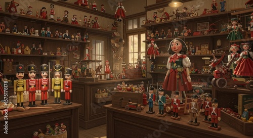 Whimsical toy emporium showcasing handcrafted dolls and wooden soldiers brimming with nostalgia