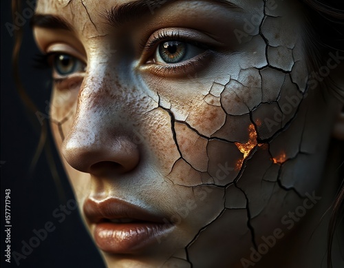 Cracked human face glowing from within, symbolizing emotional struggle and vulnerability.