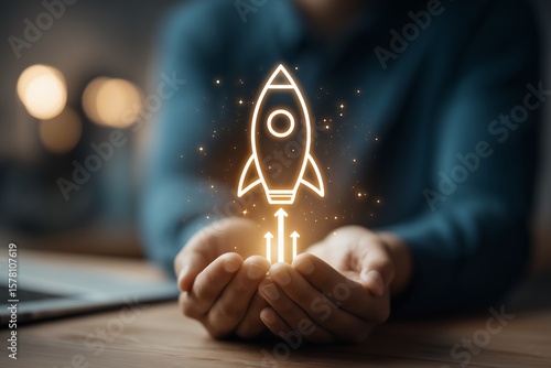 Person's hands holding glowing digital rocket icon symbolizing startup launch and business growth on dark background, concept for new venture funding, corporate expansion strategy, and innovative