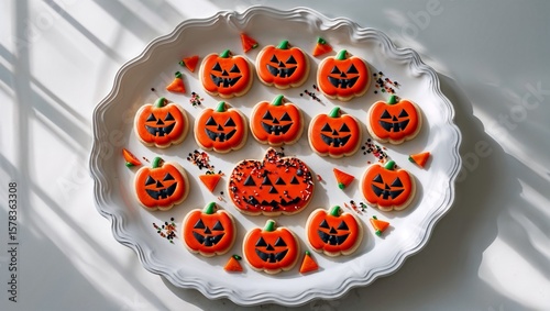Discover a vibrant collection of Halloween-themed pumpkin cookies with spooky faces perfect for seasonal parties, beautifully arranged on a white plate with festive sprinkles, ideal for baking and hol