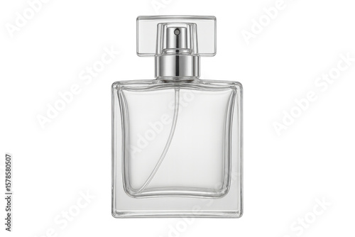 Sleek glass perfume bottle featuring silver atomizer, reflecting minimalist design against transparent backdrop