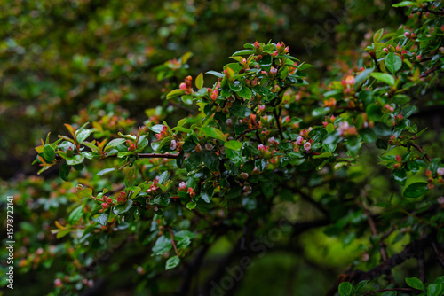 Zielony krzew z małymi czerwonymi owocami po deszczu