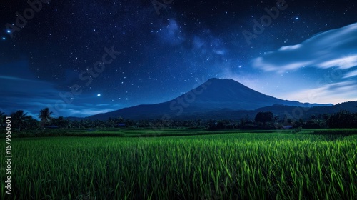 A majestic, dark-blue volcano dominates a vibrant green rice paddy under a breathtaking, star-studded night sky; wispy clouds add depth