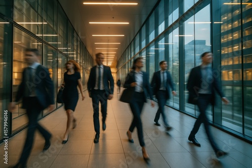Business People Walking in Modern Office Building:A diverse group of business professionals stride purposefully through a sleek, modern office building.