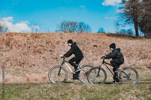 Two cyclists enjoying a sunny ride through a scenic landscape. Perfect spring day for outdoor adventures