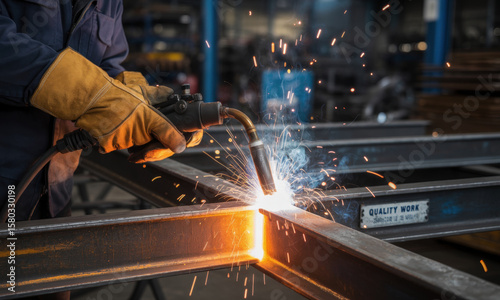 Skilled welder hands in protective gloves performing metal welding with bright sparks in an industrial factory.