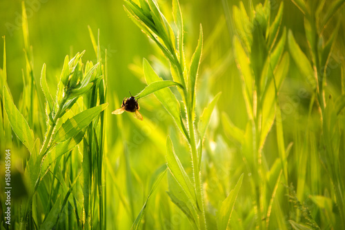A bumblebee illuminated by golden backlight, surrounded by green grass stems. The warm evening sun creates a glowing, dreamy atmosphere. Artistic macro nature photo filled with summer light, tranquili