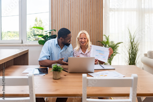 Finance and economy. Young couple, small business owners, working online at home office, having video call for presentation and online coaching. E-commerce man and woman professional occupation