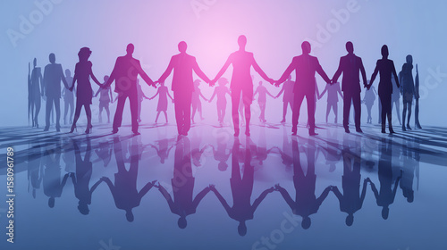 Silhouettes of diverse people holding hands in unity, symbolizing collaboration and togetherness against a vibrant backdrop.