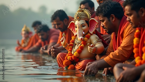 Devotees immersing a beautifully decorated Ganesh idol into a river, with vibrant colors, water splashes, and emotional farewell moments.