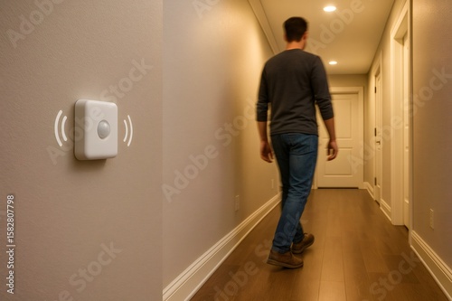 Smart home automation system with motion sensor detecting presence and activating lights in the corridor as homeowner is walking