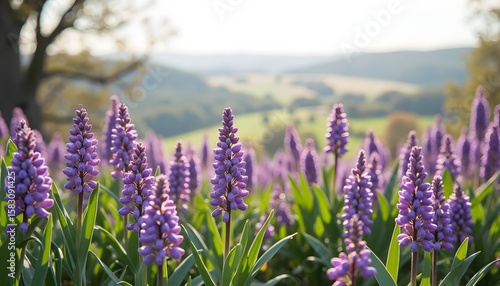 Lavenderlike purple flower spikes stand upright in a field with green foliage blurred hills in the background