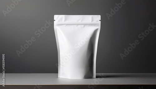 white mockup displaying blank stand up pouch presenting clean packaging design opportunity with minimalist background for brand visualization and marketing presentation
