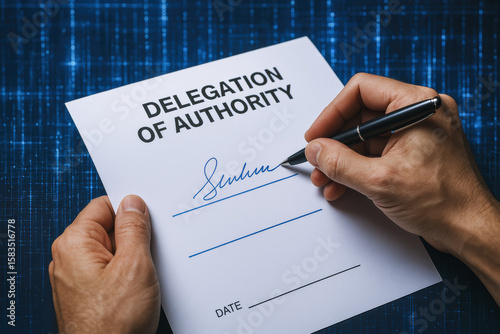 A formal agreement transfer is finalized as a signs a delegation authority document symbolizing responsibility and governance