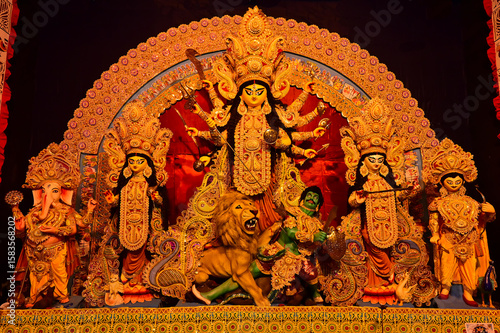 Howrah, West Bengal, India- 11.10.2024 : Beautifully decorated Durga idol is being worshipped inside puja pandal. Durga Puja is biggest festival of Hinduism, celebrated all over the world.