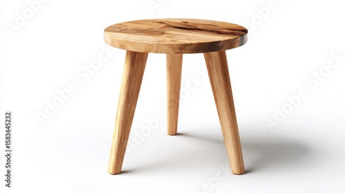 Stunning photo of wooden stool with round seat, three legs on white background. Simple minimalist design, clean lines. Natural wood grain texture. Scandinavian style furniture.