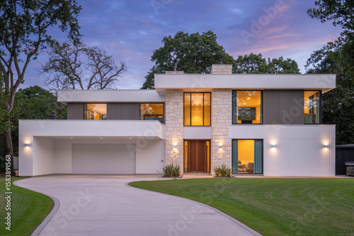 A modern luxury house photographed at dusk with warm interior lighting visible through large windows.