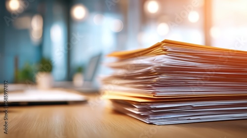 A stack of paper documents and folders sits on a wooden desk in a bright, modern office environment