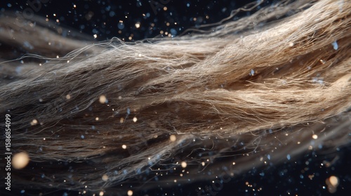 Hemp hurd fibers undergo steaming, enhancing their pliability and lightness, preparing them for processing into transparent material, with subtle golden particles adding a touch of elegance