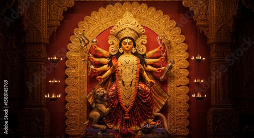 Temple backdrop with Goddess Durga’s idol decorated with garlands, glowing warm gradient from gold to red