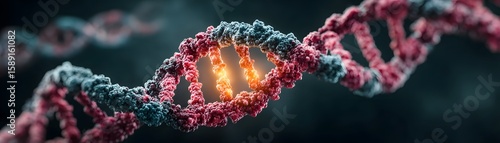 A close-up 3D illustration of a DNA double helix with highlighted glowing segments, representing genetic information and molecular biology.