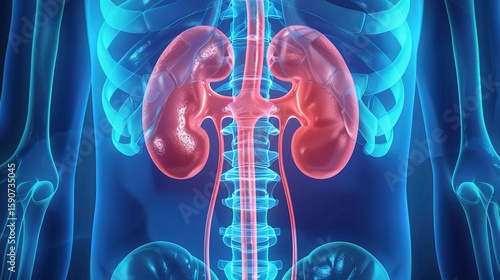 Anatomical view of a kidney showing its bean shape, renal cortex, medulla, nephrons, and ureter connection, highlighting its role in filtering blood, producing urine, and regulating fluid balance with