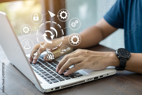 Software update or operating system upgrade concept. Improved functionality in the new version and improved security. Person using laptop with Software update and upgrade technology.
