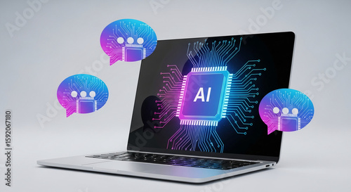 Laptop screen displays AI microchip circuit, surrounded by chat bubbles, symbolizing AI communication and digital interaction, showcasing technological advancement