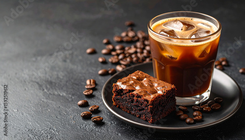 A glass of iced coffee served with a decadent dark chocolate brownie on a plate for a perfect afternoon break