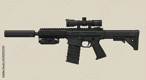 Illustration of a black assault rifle with scope and silencer on a light background