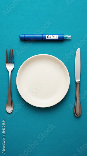 GLP-1 injection with empty plate and cutlery, concept of weight loss medication and appetite control, semaglutide treatment for obesity, medical approach to dieting and hunger regulation