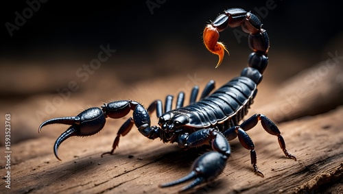 Detailed scorpion displays segmented body and menacing claws against dark wood grain background.