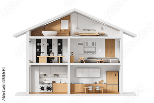 Modern minimalist house cross-section with detailed interior layout including kitchen, living room, office, bedroom, and bathroom. Concept visualization. 3D Rendering