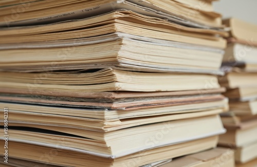 Large stack of old paper documents, books, neatly organized. Close-up on numerous paper files piled high, suggesting archive, library, office storage. Records represent volumes of literature,