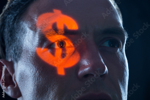 gieriger Mann mit Dollarzeichen im Auge als Symbol für Geld Gier und Macht