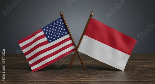 United States and Indonesia desk flags on a wooden table. A concept of international relations, diplomacy, political summit, and bilateral talks.
