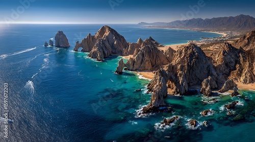 Aerial image of Lands End, the southernmost point of the Baja California peninsula, and El Arco de Cabo San Lucas, Baja California Sur, Mexico. Generative AI .