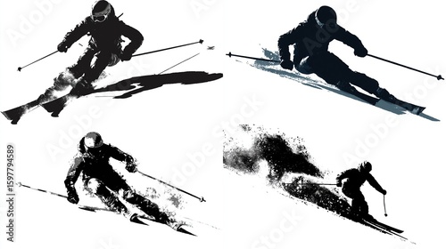 Four ski racers in dynamic poses, stylized silhouettes against white background. Snow and ski trails depicted with texture