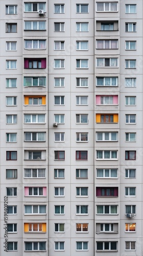 Symmetrical view of an urban apartment building with diverse colored window frames, highlighting architectural design and city living aesthetics.