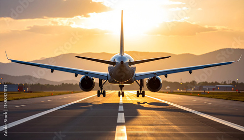 vista trasera de un avion de linea y pasajeros aterrizando o despegando en la pista de aterrizaje de un aeropuerto, el viaje comienza con luz de atardecer y sol a contraluz