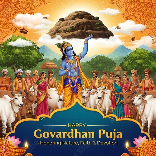 Lord krishna lifting govardhan hill protecting villagers and cows during monsoon season festival