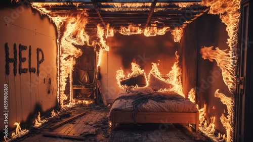 Fiery entrapment: a room engulfed in flames HELP scrawled on the wall.
