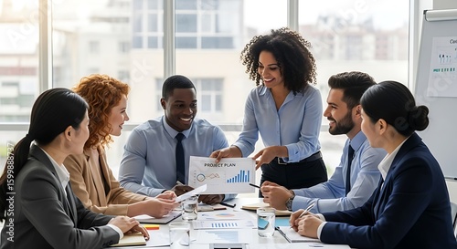 Diverse team discussing project plan during meeting in bright office with charts and graphs, working collaboratively to achieve goals