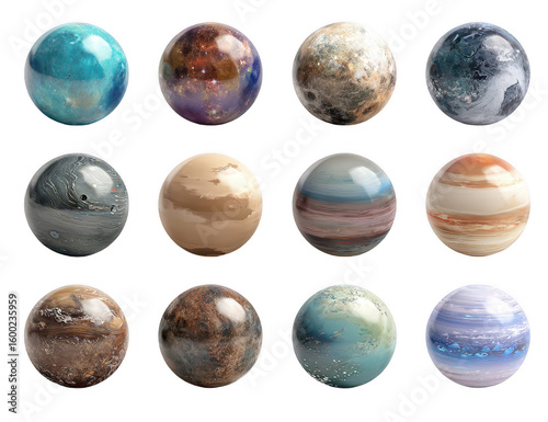 Twelve stylized, spherical planets in various colors and textures