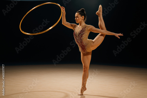 Photorealistic rhythmic gymnast under 20 mid-jump with raised hoop under arena lights. Concept of summer sport, precision, lightness, control, and elite rhythmic gymnastics performance.