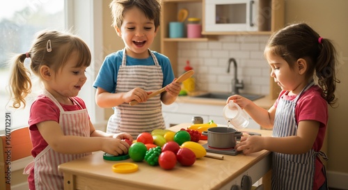 Happy children playfully prepare pretend food in bright kitchen sunlight. AI Generated