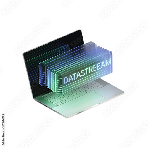 Abstract digital datastream flowing from a laptop screen isolated on transparent background
