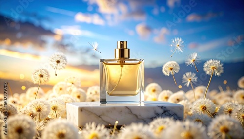 A sophisticated vector illustration of a fragrance bottle amidst a dreamy dandelion field at sunset.