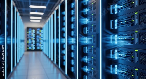 Data center aisle featuring sleek compact servers and vibrant airflow lighting effects.